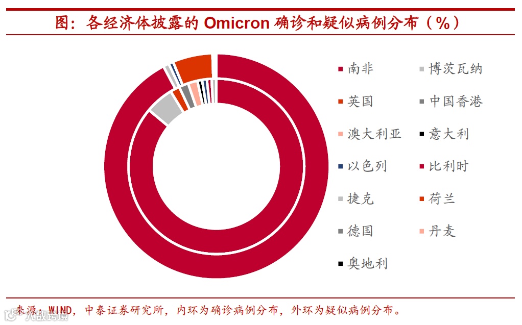 十多个经济体已有涉及,南非病例最为集中。根据BNONews所做的统计,截止目前,全球共有13个国家或地区发现了由Omicron变异毒株引发的新冠确诊或疑似病例,不过上报给GISAID变异毒株病例的国家和地区只有7个。按照BNO News的统计,Omicron变异毒株引发的新冠疫情仍主要集中在南非,其涵盖了目前确诊病例的86%和疑似病例的92%,而其它地区确诊病例数量均在个位数。