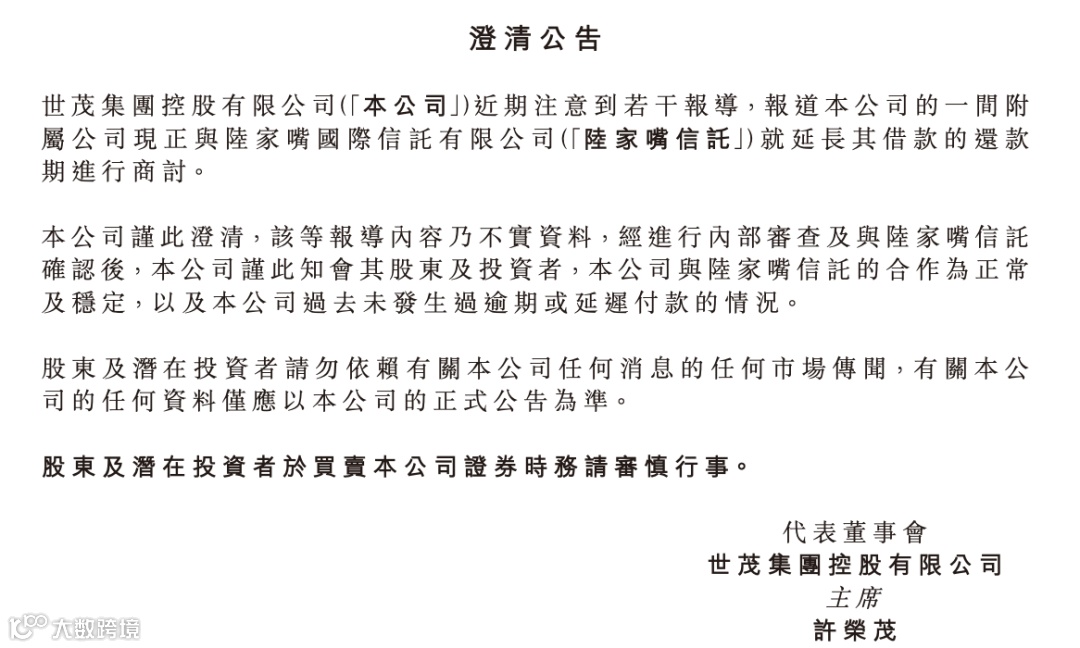 5日晚,世茂集团在港交所发布澄清公告称,经进行内部审查及与陆家嘴信托确认,公司与陆家嘴信托的合作为正常及稳定,公司过去未发生过逾期或延迟付款的情况。