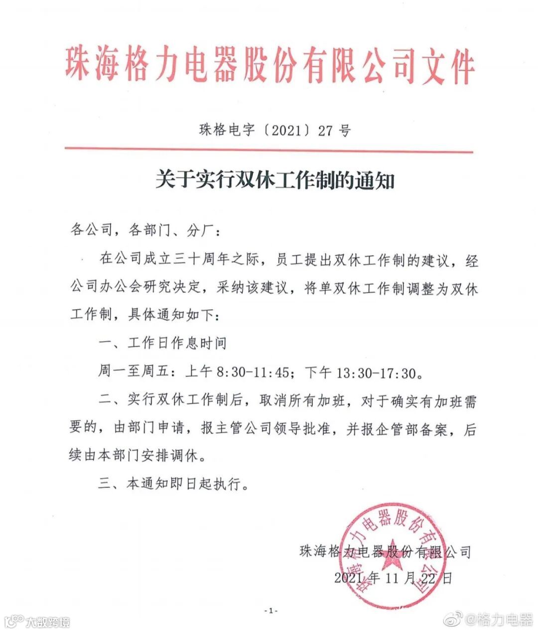 11月22日晚,格力电器发布通知,在公司成立三十周年之际,员工提出双休工作制的建议,经公司办公会研究决定,采纳该建议,将单双休工作制调整为双休工作制,即日起执行。