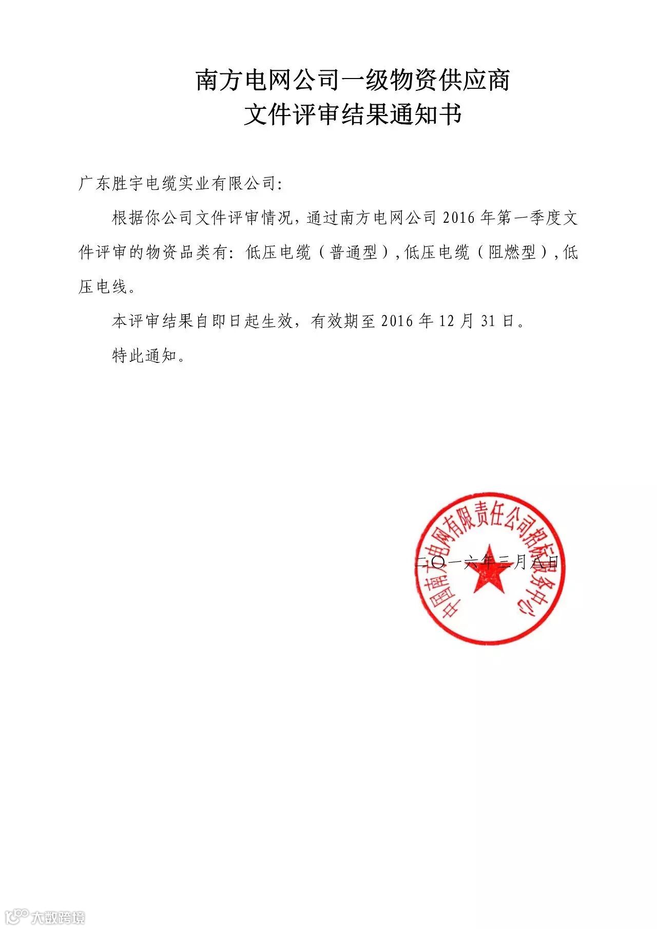 2016年3月8日,广东胜宇电缆实业有限公司顺利通过南方电网公司2016年第一季度文件评审物资品类审查,顺利获得2016年“南方电网公司一级物资供应商”资格。此次评审通过,意味着胜宇电缆在南方区域市场跨出了至关重要的一步,对后期市场布局将意义深远。