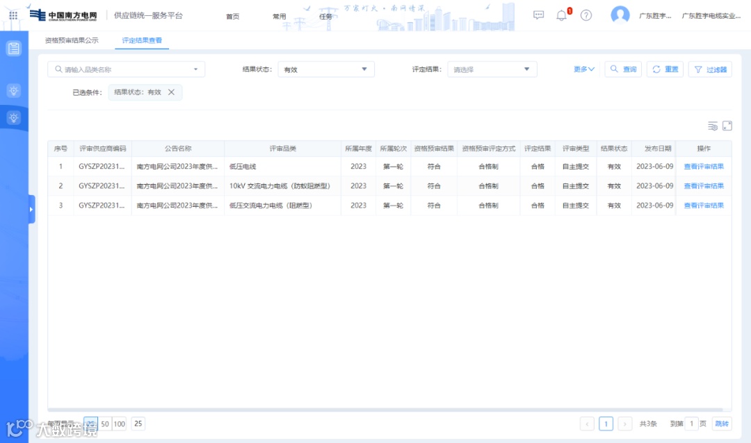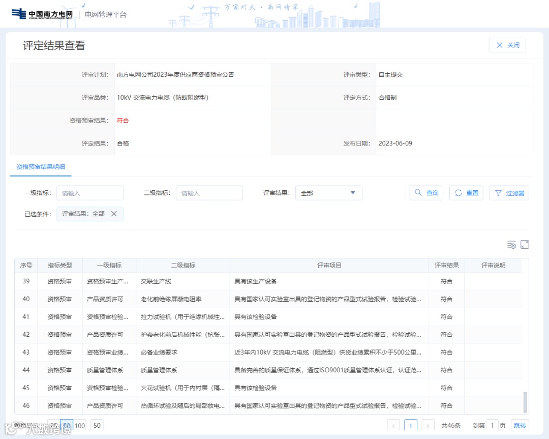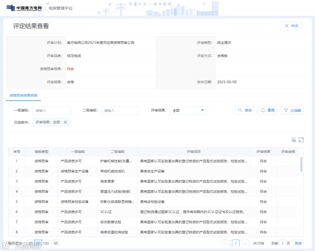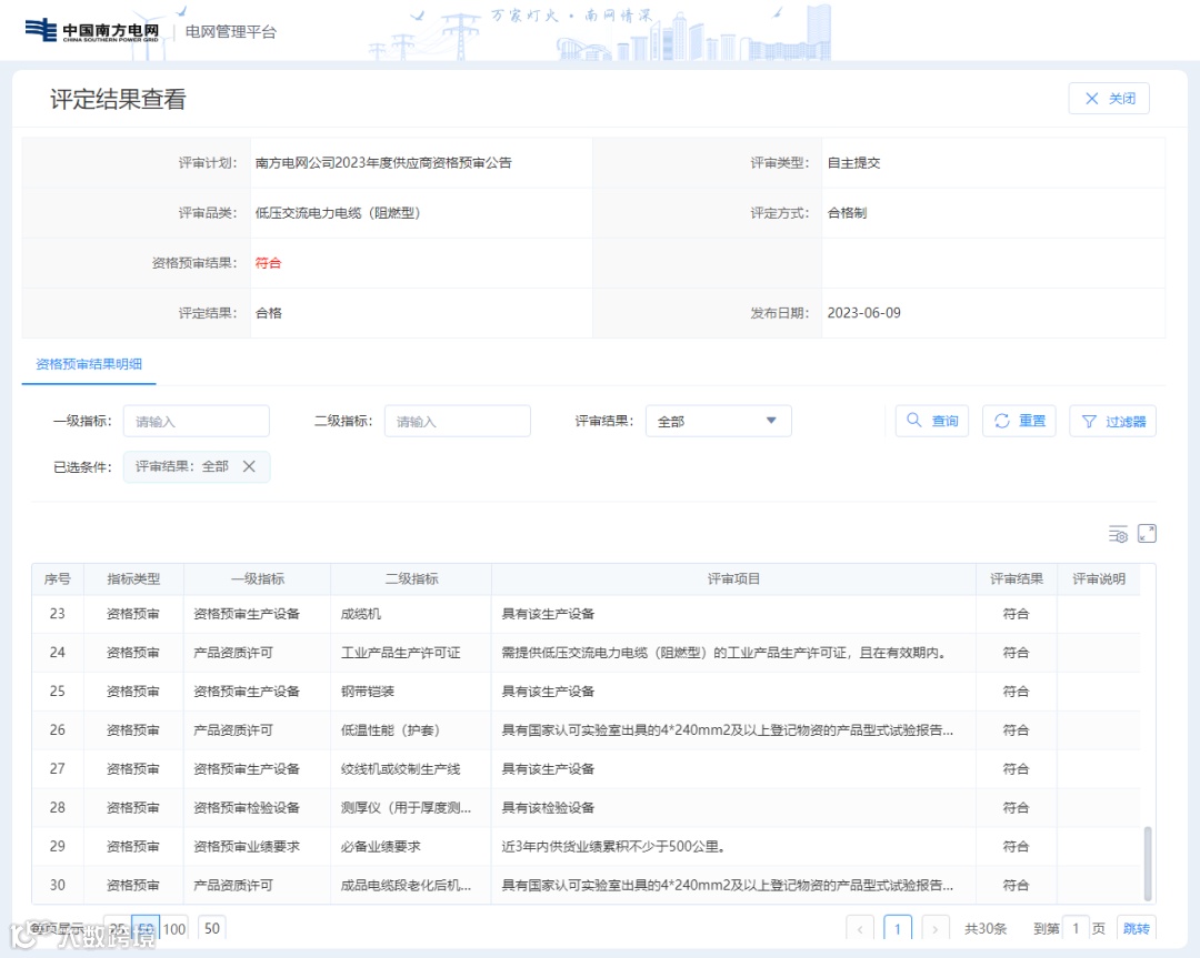 2023年6月9日,南方电网公司发布2023年第一轮供应商及检测机构资格预审通过名单,胜宇电缆10kV 交流电力电缆(防蚁阻燃型)、低压交流电力电缆(阻燃型)和低压电线等多项产品均通过评审。胜宇电缆已经连续多年入围南方电网公司一级物资供应商名录。