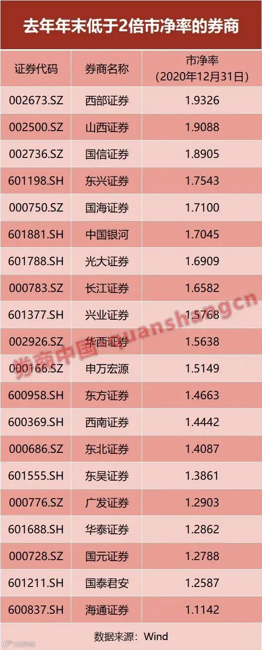 对标此前证券行业收购情况来看,中信证券收购广州证券给出的市净率约为1.2倍,天风证券收购恒泰证券的市净率约1.5倍。以2020年12月31日为交易日期计算,市净率超过2倍的券商有20家,1.5倍至2倍的11家,另有9家市净率在1.0倍至1.5倍。