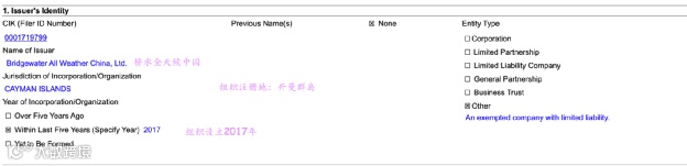 来源:SEC 桥水的这只中国基金注册于开曼群岛。表格D披露的为总销售金额,可能会与当前的管理规模有一定的出入,因为涉及赎回和净值变化等因素。