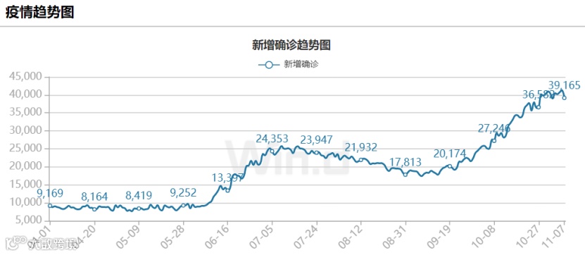 另外,俄罗斯的疫情也非常凶险。11月6日,俄罗斯单日新增新冠确诊病例数再度刷新历史最高记录,达到41335例;当日新增死亡1188例,也刷新了历史最高记录。截止目前,俄罗斯累计确诊病例数达879万例,累计死亡24.7万例。