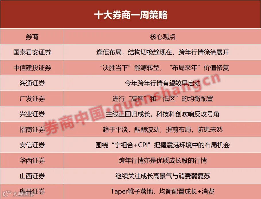 国泰君安证券表示,下一个时点在跨年,逢低布局。上周市场震荡调整,上证指数自8月底以来再次下穿3500点。我们认为此轮调整源于负面预期在短期的集中汇聚,市场并无系统性调整风险。当前市场对分子端下行预期充分,对分母端降准预期修正亦已反应充分,往后看我们认为跨年行情将随年底政策不确定性的下行徐徐展开。1)盈利端:负增长压力不会止步于三季度,未来两个季度盈利端仍将继续面临零增长压力,但市场对盈利下行已有充分预期;2)分母端降准预期:四季度降准概率降低,但市场对此亦已反应充分;行至年底,2022Q1宽松预期会再次升温;3)分母端风险评价(边际驱动):当前政策不确定性仍处高位,市场对下阶段核心经济政策的预期较为模糊。但近期随房产税/消费税等政策的推进,政策不确定性将开启下行之路,往后看政策不确定性将随年底各重要会议的陆续召开进一步下降,风险评价的下行将驱动跨年行情徐徐展开。结构配置上,维持“站在风格切换的起点”与“低估值收获季”的判断,当前逢低布局低估值板块为最优解。