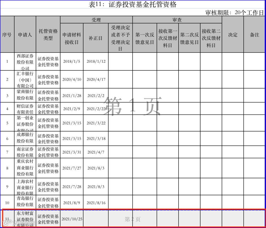 证监会公示信息显示,除了东方财富证券以外,目前排队等待证券投资基金托管资格的金融机构还有10家,其中包括四家券商(西部证券、财信证券、第一创业证券、南京证券)以及6家银行(汇丰银行、蒙商银行、成都银行、重庆农村商业银行、上海农村商业银行、青岛银行)。