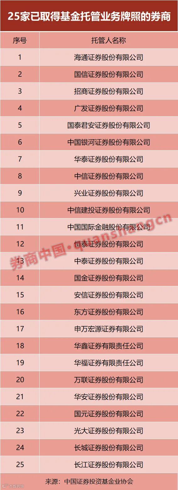 根据中基协托管机构公示数据,目前全市场共有25家券商取得了基金托管业务牌照。