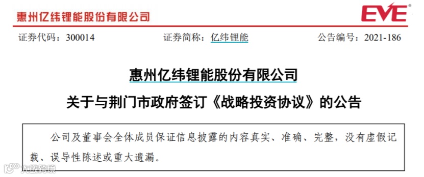 11月4日晚间,亿纬锂能公告,受益于新能源汽车行业蓬勃发展,结合公司动力储能电池项目实际情况及未来经营发展规划,11月4日,公司与荆门市人民政府签订《战略投资协议》,公司及其子公司计划在荆门市掇刀区完成固定资产投资305.21亿元,征地约3000亩,建设年产152.61GWh的荆门动力储能电池产业园项目,荆门市政府为荆门动力储能电池产业园建设和锂离子动力储能电池配套产业的引入提供必要的支持和协助。