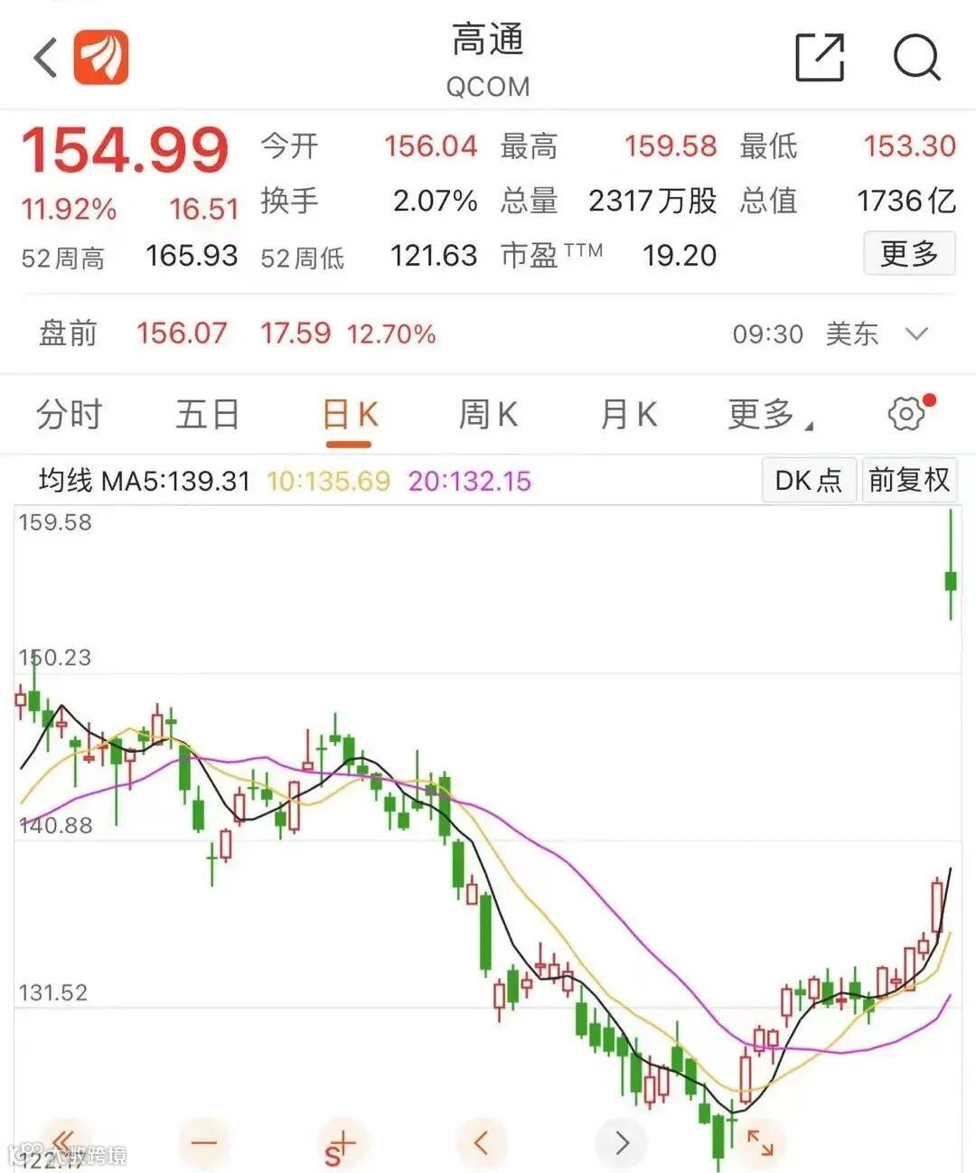 高通的大涨,来自于自身的业绩。高通财报显示,第四财季营收为93.36亿美元,同比增长12%;不按照美国通用会计准则,调整后净利润为29.16亿美元,同比增长75%。