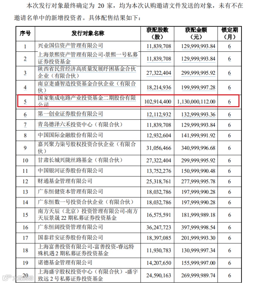 11月4日晚间,A股上市公司——集成电路封装测试企业华天科技披露定增结果,公司此次非公开发行股票价格为10.98元/股,募集资金总额为51亿元。其中,国家集成电路产业投资基金二期(简称“大基金二期”)获配11.3亿元,获配股数为1.03亿股。
