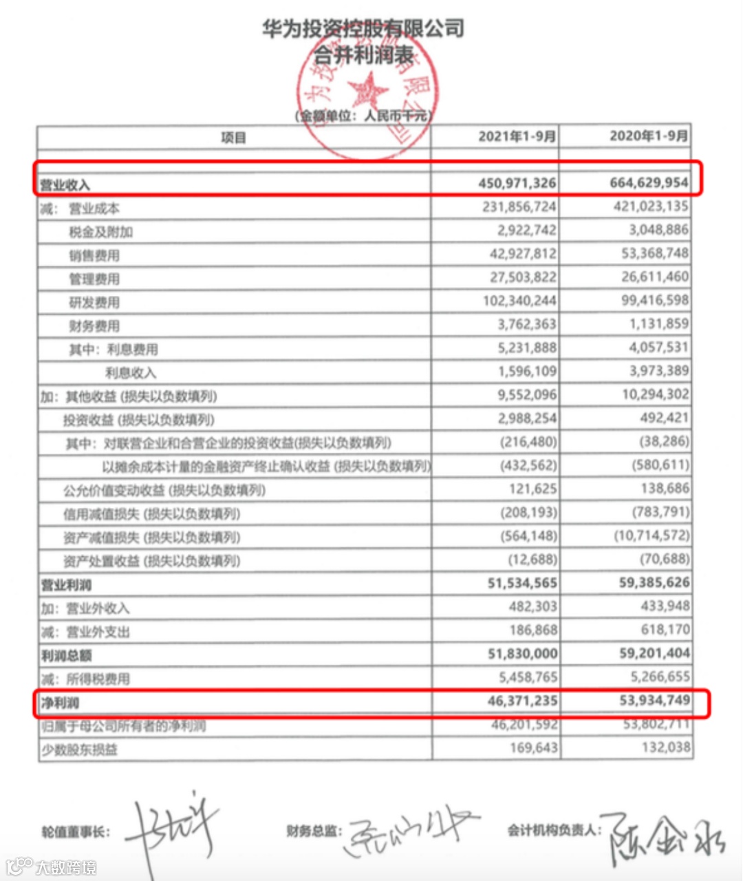 10月29日,华为公布三季报,营业收入和净利润分别为4510亿元和464亿元。
