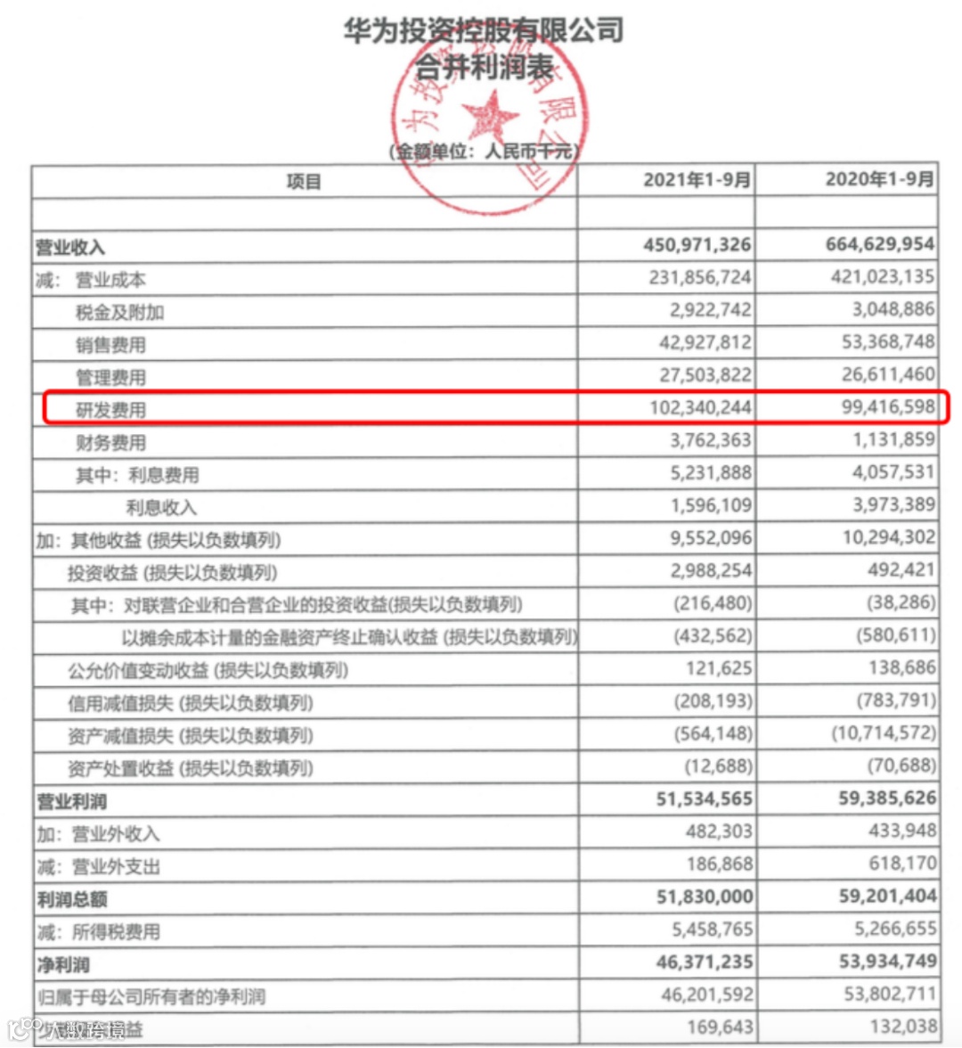2021年前三季报显示,在收入下滑之下,华为大幅减少了销售费用,但是研发费用却有增无降,达到了1023.4亿元,较去年同期的994.1亿元增加29亿元左右。
