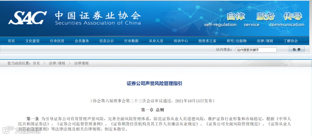10月15日,中国证券业协会发布了《证券公司声誉风险管理指引》(简称《指引》),意在完善证券公司全面风险管理体系,防范证券从业人员道德风险,推动建立行业声誉约束机制,维护证券行业形象和市场稳定。