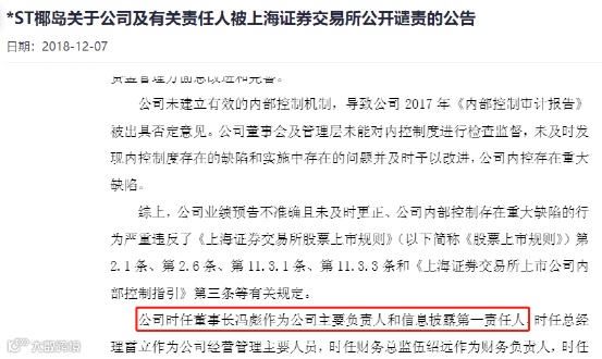 2018年12月海南椰岛再次公告,收到上交所纪律处分决定书,因公司业绩预告不准确且未及时更正、公司内部控制存在重大缺陷等问题,时任董事长冯彪作为主要负责人和信息披露第一责任人,受到公开谴责。