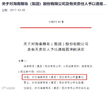 2017 年12月海南椰岛公告,收到上交所纪律处分决定,海南椰岛时任董事长冯彪因会计信息差错、业绩预告严重滞后等信息披露违规事项,受到通报批评。