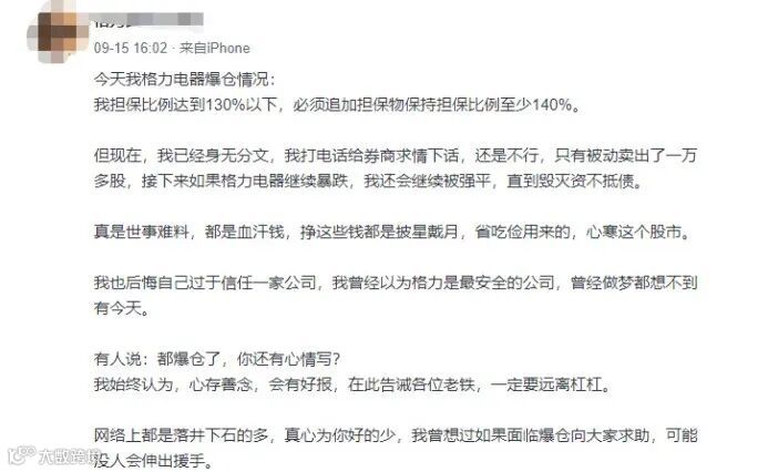 该网友表示:我担保比例达到130%以下,必须追加担保物保持担保比例至少140%。但现在,我已经身无分文,我打电话给券商求情也不行,只有被动卖出了一万多股,接下来如果格力电器继续暴跌,还会继续被强平,直到毁灭资不抵债。