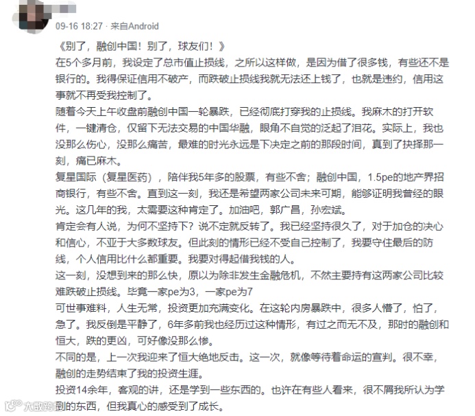 9月16日,在股票投资交流社区,网友自曝称,因为借了很多钱,为保证信用不破产,一键清仓了其融资买入的股票——融创中国。