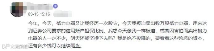 有同样经历的还有格力电器的投资者,近日,在格力电器股票投资交流社区中,有网友称,格力电器又让其经历一次股灾,其融资买入的格力电器被迫卖出,用来达到证券公司要求的信用账户担保比例。