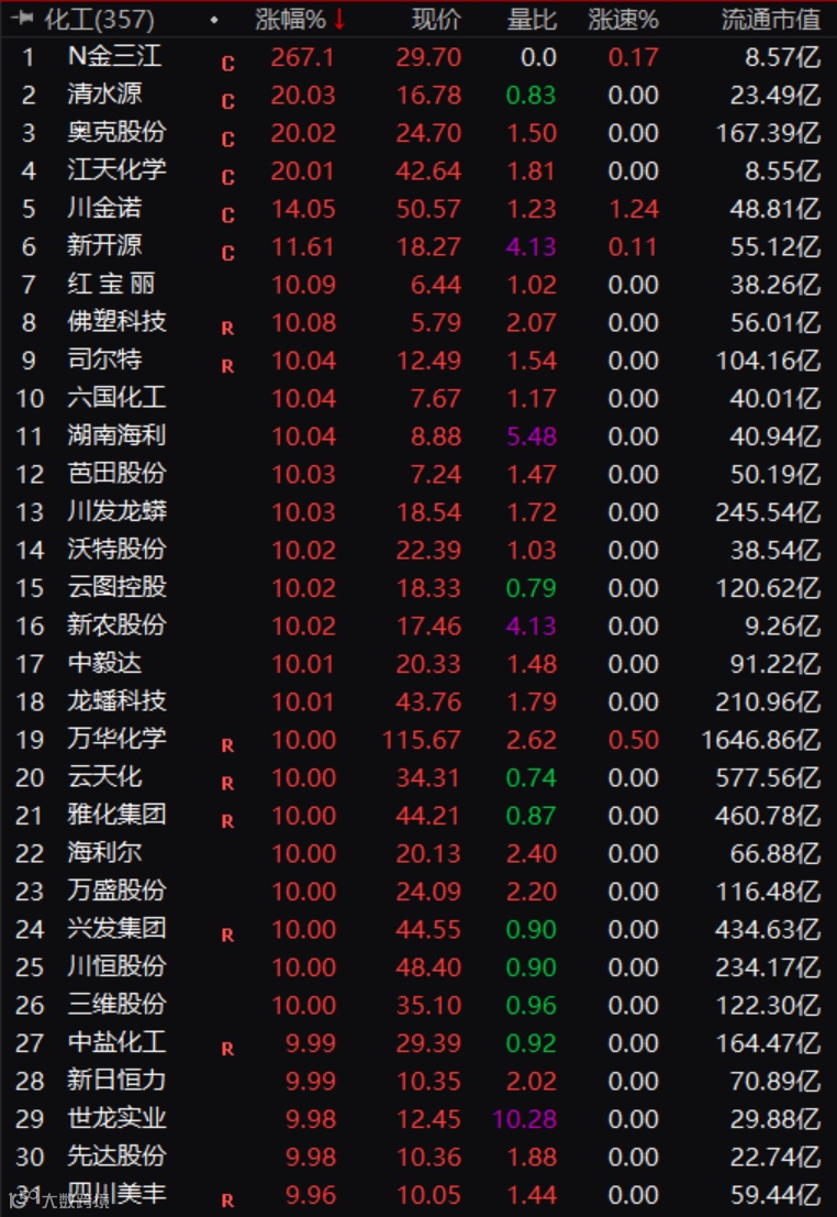 可能正是受云南限产传闻的影响,整个化工板块周一疯狂迎接涨停潮,涨停或涨由超10%个股高达30只(除新股之外)。