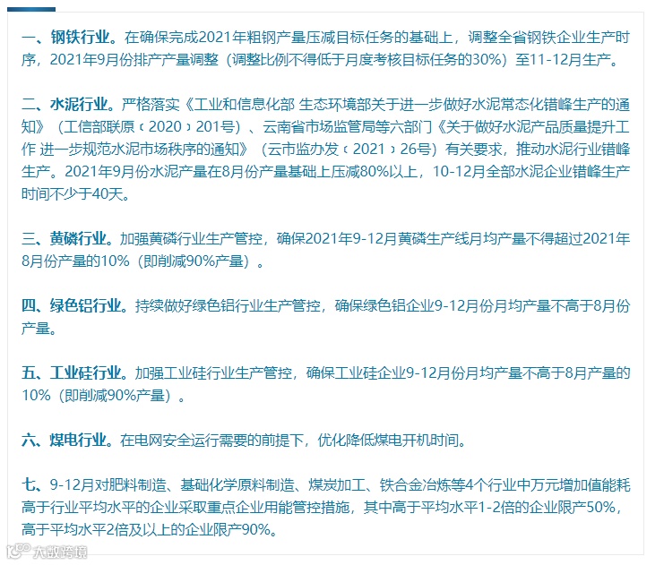 那么,究竟发生了什么?分析人士认为,主要有两个原因:一是上周五隔夜外围周期类商品涨幅惊人,在一定程度上带动了市场情绪;二是一份题为《云南省节能工作领导小组办公室关于坚决做好能耗双控有关工作的通知》在全网疯传,从该文件的内容来看,涉及到多个行业的限产,其中,黄磷和工业硅产能被削减90%。