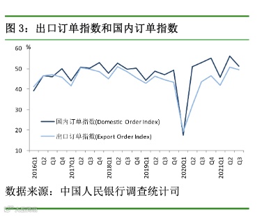 国内订单指数为 51.1%,比上季下降 4.9个百分点,比去年同期下降 1.8 个百分点。其中,21.6%的企业家认为本季国内订单比上季“增加”,59.1%认为“持平”,19.3%认为“减少”。