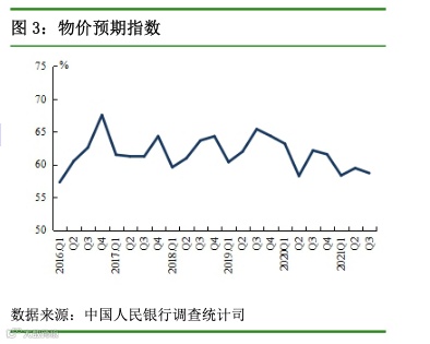 从城镇储户的角度看,消费品价格的变动会影响其对通胀的预期。央行调查结果显示,对下季度,物价预期指数为 58.7%,比上季下降 0.8 个百分点。其中,23.5%的居民预期下季物价将“上升”,57.3%的居民预期“基本不变”,8.0%的居民预期“下降”,11.1%的居民“看不准”。