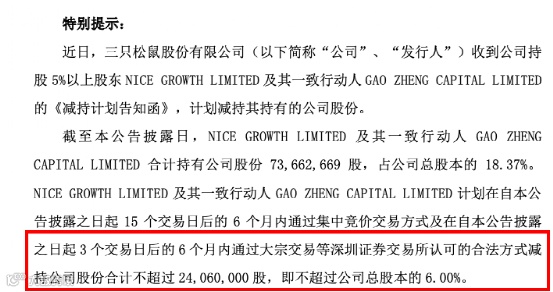 另外,9月30日晚,不仅良品铺子,同日晚间,三只松鼠发布了股东减持的预披露公告:NICE GROWTH LIMITED及其一致行动人GAO ZHENG CAPITAL LIMITED计划在9月30日起15个交易日后的6个月内通过集中竞价交易方式及在9月30日起3个交易日后的6个月内通过大宗交易等方式减持公司股份合计不超过24,060,000股,即不超过公司总股本的6.00%。