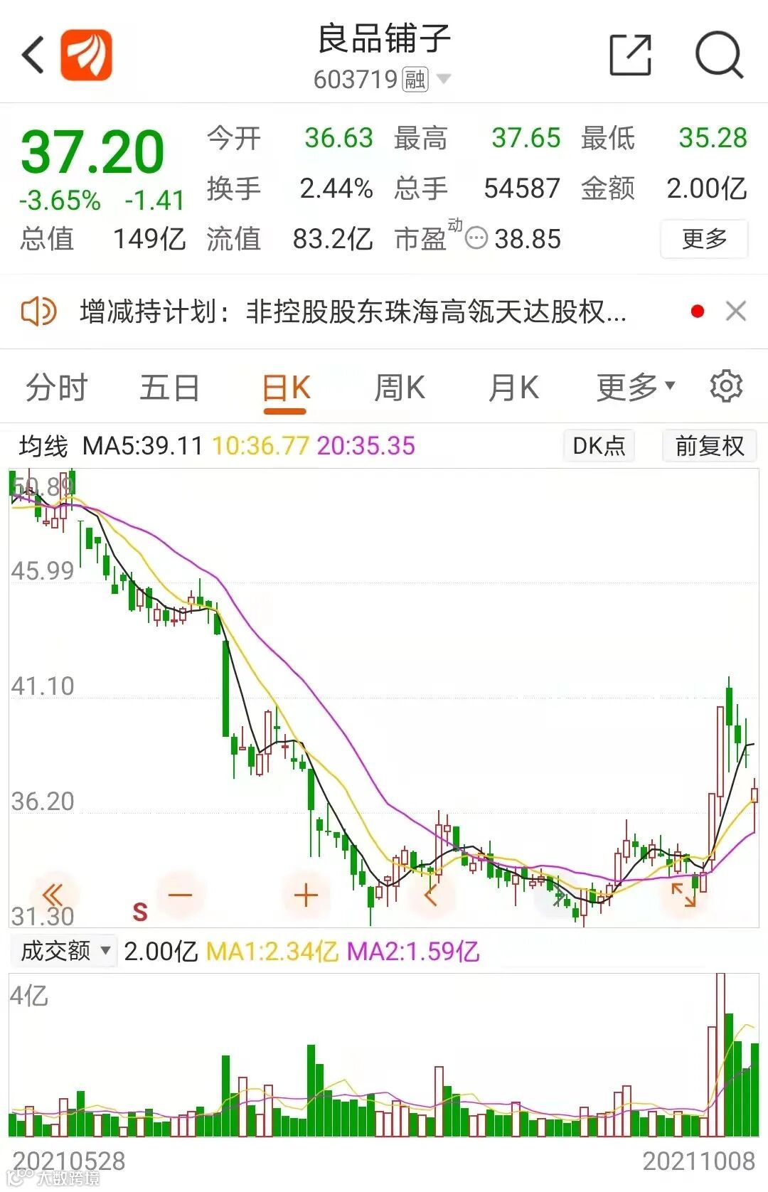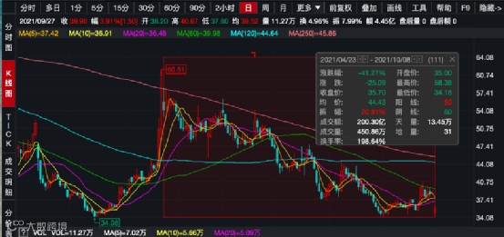 实际上,良品铺子股价自去年下半年便开始有疲惫之势,在2020年7月中旬冲破86元历史新高后震荡下滑,截至今年9月30日收盘于38.61元/股,跌幅超50%。从年初至今,良品铺子的股价跌幅也已超35%,市值缩水超80亿。