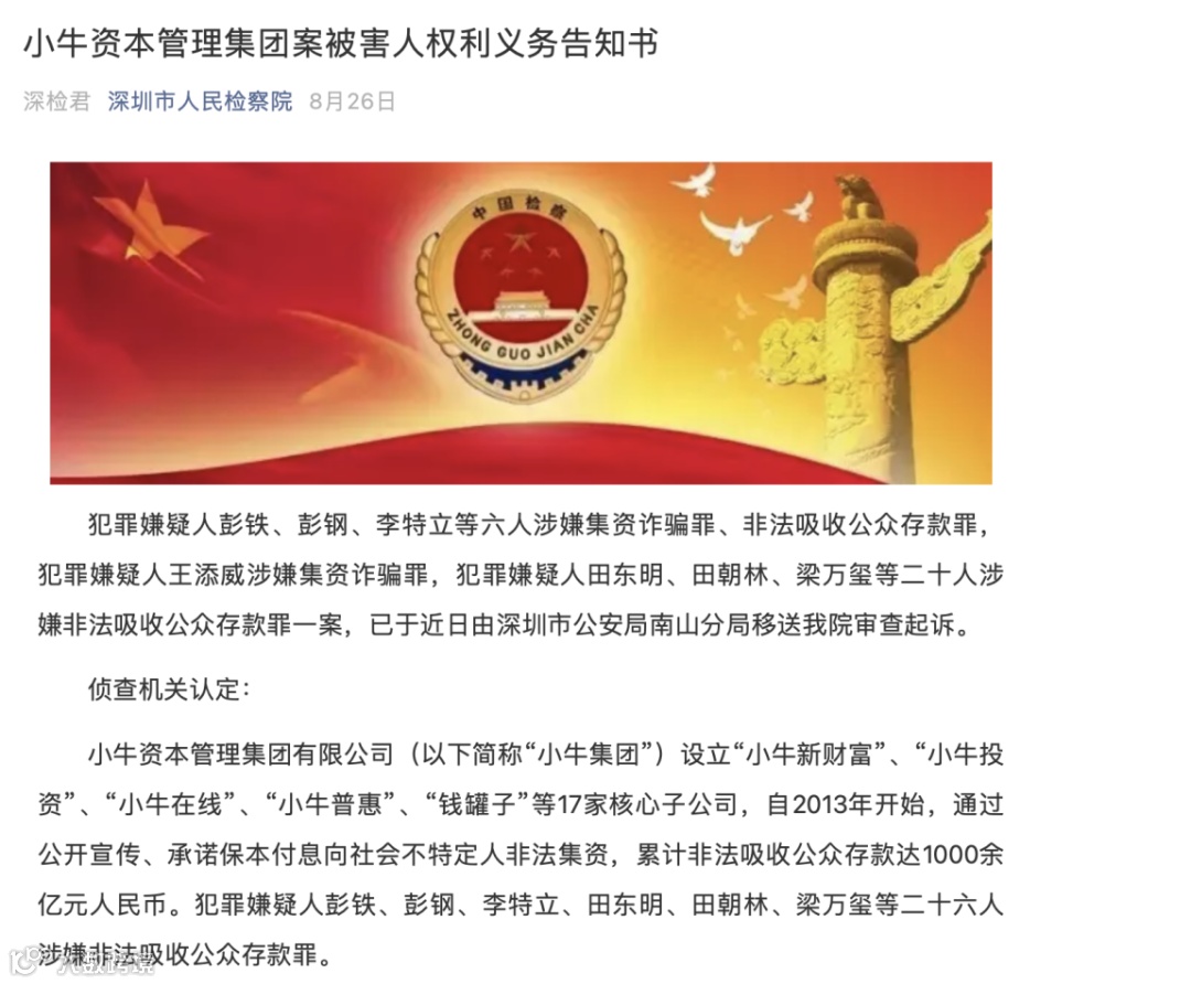 就在上月26日,深圳市人民检察院通过其官方微信公众号发布《小牛资本管理集团案被害人权利义务告知书》称,犯罪嫌疑人彭铁、彭钢、李特立等6人涉嫌集资诈骗罪、非法吸收公众存款罪,犯罪嫌疑人王添威涉嫌集资诈骗罪,犯罪嫌疑人田东明、田朝林、梁万玺等20人涉嫌非法吸收公众存款罪一案,已于近日由深圳市公安局南山分局移送检察院审查起诉。