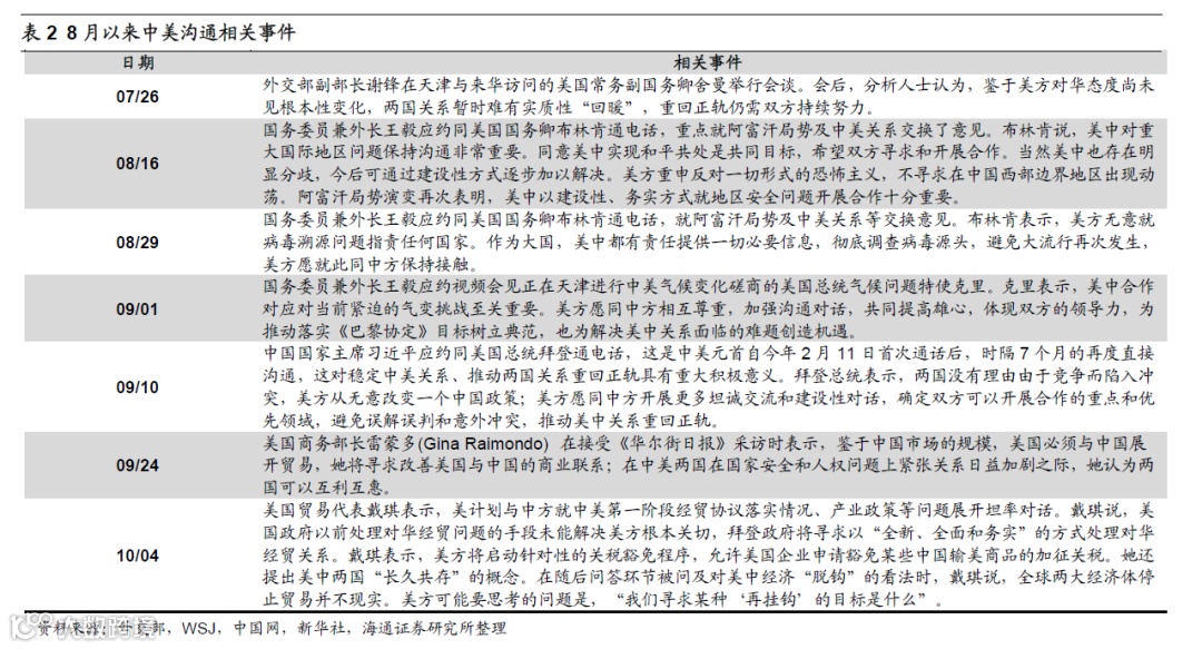 外部环境有望改善,提升风险偏好。10月4日,新华社报道,美国贸易代表戴琪表示,美计划与中方就中美第一阶段经贸协议落实情况、产业政策等问题展开坦率对话。戴琪表示,美方将启动针对性的关税豁免程序,允许美国企业申请豁免某些中国输美商品的加征关税。她还提出美中两国“长久共存”的概念。10月6日,外交部公布,根据中美元首9月10日通电话达成的共识,经中美双方商定,中共中央政治局委员、中央外事工作委员会办公室主任杨洁篪将同美国总统国家安全事务助理沙利文在瑞士苏黎世举行会晤。双方将就中美关系及有关问题交换意见。其实8月以来的一系列事件均表示中美关系正在积极改善中。未来需进一步关注中美关系进展,比如即将在10月底举办的G20峰会以及11月初举办的联合国气候大会。参考18年3月底与19年5月,中美贸易摩擦升级后股市风险偏好均大幅下降,如果未来中美关系改善将有助于市场风险偏好提升。除此之外,美国联邦政府债务危机近期也引发了投资者担忧。但是在《有哪些政策值得期待?-20210921》中我们分析过,回顾美国2011、2013年两次上调联邦政府债务上限事件,虽然均有波折,但是最终美国政府都顺利上调了法定债务上限,全球股票市场的风险偏好均会修复。