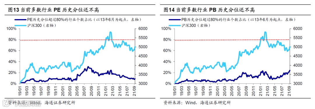 过去Q4股市上涨概率高,牛市后期往往众乐乐。整体上我们判断,19年初以来的三年牛市还在途中,今年处在基本面和情绪面驱动的牛市最后阶段,全部A股的ROE仍在上升趋势中,情绪还有上升的空间,往后看未来3-6个月市场整体趋势较好。部分投资者担忧“牛不过三”,但从基本面的角度看,我们测算21年全部A股归母净利润预计增速为35%-40%,两年年化增速为16-20%,即估值不出现大幅压缩的情况下,今年A股年线收阳的概率较大。且从日历效应看,Q4市场的胜率往往较高:以沪深300指数刻画,2005年至今历年Q4胜率(取得正收益的概率)为65%,高于前三个季度。从历史统计看,牛市后期特点是众乐乐。我们在《以史为鉴:牛市高点特征是众乐乐-20210824》中分析过,历史上牛市指数达到顶点时多数行业估值处于偏高位置,而行业离散度均为阶段性低点。以05-07年以及12-15年牛市为例, 07/10市场见顶时PE和PB(TTM,整体法)自02年1月以来分位数超过80%的行业个数占比分别为90%和70%,15/06 市场见顶时PE和PB(TTM,整体法)自08年10月以来历史分位达到80%以上的行业占比均接近90%。目前各行业还没有出现这种现象,以前一轮牛熊周期的低点(13年6月)为起点,当前仅有9%(18%)的申万二级行业PE(PB)(TTM,整体法)超过了80%的历史分位。我们预计未来3-6个月市场将迈向高点,行业的特征便是众乐乐,因此后续各行业的机会均值得关注。