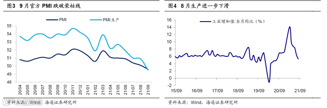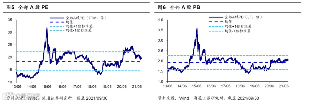 政策面扰动基本面。我们在前期报告中多次进行测算,历史数据显示A股ROE(TTM)上行期持续7个季度,本轮A股ROE上行的起点是20Q3,我们预计回升趋势将持续至22Q1,历史上看牛市指数的高点对应ROE高点和市场情绪高点,因此我们判断本轮牛市还没走完。但是近期投资者开始担忧ROE回升的趋势可能提前终止,原因是今年政策整体偏紧,尤其近一个月,在“双碳”(碳中和、碳达峰)背景下,各地为了达成年初制定的能耗“双控”(能耗强度、能耗总量)指标纷纷“拉电限闸”对企业实行“双限”(限电、限产)。在《双限双控的影响与展望-20210929》一文中我们分析过,部分地方为了应对考核而采取“一刀切”双限政策虽然执行起来较为简单直接,但难以顾及经济全局,可能拖累经济增长。8月经济数据已经进一步下滑,比如工业增加值当月同比从7月的6.4%下降到8月的5.3%。9月30日公布的9月PMI下滑至49.6,跌破荣枯线。从Wind一致预期看,21Q3GDP当季同比增速在6-8月的预测值范围在5.8-7.9%,平均为6.5%,而进入9月之后,下修至4.7-6.1%,平均为5.8%,全年GDP预测值也从之前的8.7%下修至8.5%。