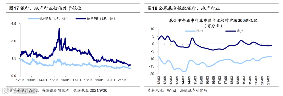 首选低估的大金融。前述政策推进下,随着经济下行压力被对冲以及房地产债务担忧消退,大金融行业有望迎来修复。大金融中的银行、券商和地产年初至今涨幅位居申万二级行业后1/3分位,估值处在低位,当前(2021/9/30,下同)PE(TTM,整体法)来看,银行为5.5倍(处17%分位)、房地产为10.1倍(处23%分位)、证券为19.4倍(处21%分位),且在基金配置比例低,21Q2基金重仓股中券商相对沪深300超配0.9个百分点,银行低配8.3个百分点,房地产低配1.2个百分点。其中,券商性价比最好。2019、2020年券商净利润同比分别为75%、36%,对应券商指数全年最大涨幅为56%、55%,而今年上半年券商净利润累计同比为27%,申万券商指数年初至今还下跌了6%。9月17日北交所公布了个人投资者准入的资金门槛为50万元,新三板创新层准入门槛也降低至100万元,市场活跃度和流动性有望提升,因此我们认为在当前市场活跃度提升、成交量持续放大背景下券商有望迎来上涨。根据历史规律,市场的日均成交额会在牛市1、3、5上升浪中逐级放大,自今年7月以来本轮牛市5浪期间的A股日均成交额为1.3万亿,相较3浪(20/03-21/02)期间仅放大1.5倍,历史上牛市5浪日均成交额相较3浪放大1.2-6.4倍,借鉴历史本轮牛市5浪中未来单日成交额最高有望放量至2万亿,或将成为券商行情的催化剂。此外,随着前述稳增长政策发力以及地产政策面的变化,信用风险担忧有望下降,后续需继续关注房企债务风波能否妥善解决,如政策面出现更加积极的变化,低估的地产行业望出现修复机会,并带动银行板块。历史上,四季度银行地产出现修复的概率较大。