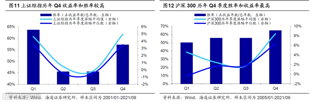 消费跟随式反弹。今年以来大消费行业跌幅较大,从2月高点计算,至今申万白酒指数下跌超过20%,家电行业下跌超过25%,医药生物下跌13%。目前(截至20210930,下同)白酒行业PE(TTM)大约45倍,已经回到20年7月以及18年初的水平,处在13年6月以来从低到高87%的分位;家电行业PE(TTM)大约16倍,处在13年6月以来从低到高41%的分位;医药生物PE(TTM)大约35倍,处在13年6月以来从低到高17%的分位。临近年底,Q4往往是大消费展望明年业绩并切换估值锚的时候。从过去20年的历史统计规律来看,食品饮料在历年Q4录得正收益的概率为52%,期间平均涨幅约为5%,中位数4%;家用电器在Q4的胜率超过60%,期间平均涨幅6%,中位数2%;医药生物的Q4胜率约为50%,涨幅均值、中位数则分别为2%、0%。随着中秋、国庆假期消费数据的落地以及消费类基金风格漂移后的回归,Q4大消费可能会迎来估值修复。