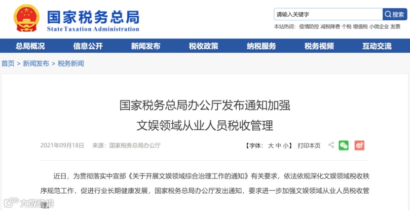 9月18日,为贯彻落实中宣部《关于开展文娱领域综合治理工作的通知》有关要求,依法依规深化文娱领域税收秩序规范工作,促进行业长期健康发展,国家税务总局办公厅发出通知,要求进一步加强文娱领域从业人员税收管理。