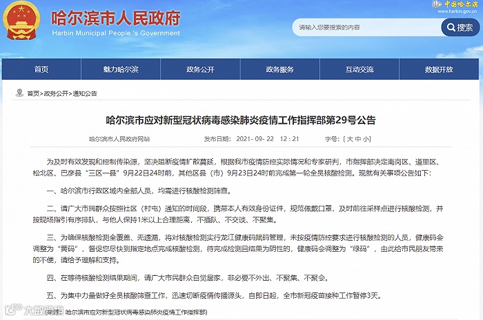 此外,据“黑龙江日报”,按照哈尔滨市政府防疫要求,要做到“非必要不离哈”;确需外出的,通过哈尔滨太平国际机场、铁路、公路以及客运站出行的人员,应及时了解目的地疫情防控工作要求,持48小时内核酸检测阴性证明,并做好自身防护。