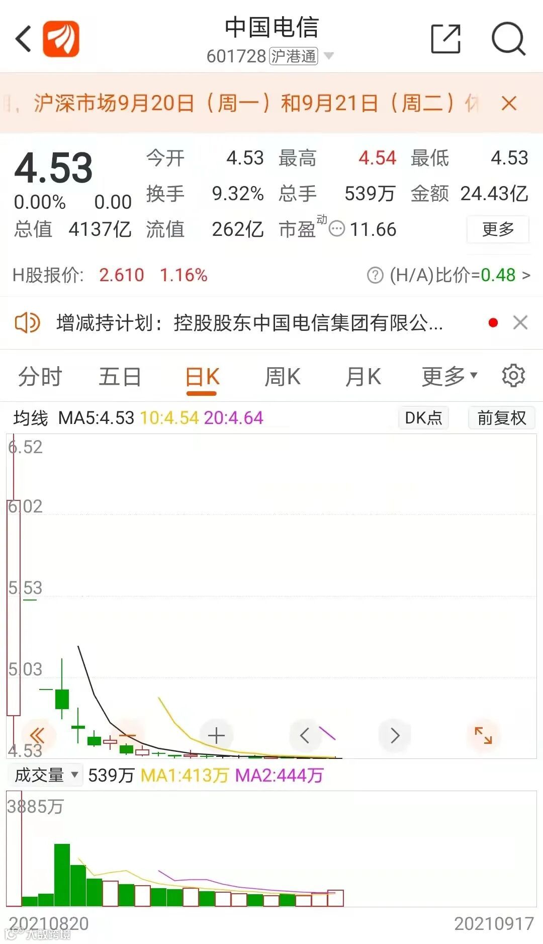 港股方面,自8月20日中国电信在A股上市后,其港股股价也一直处于回调趋势,截至9月21日收盘,中国电信港股报收2.61港元,A/H溢价率约2.09%。