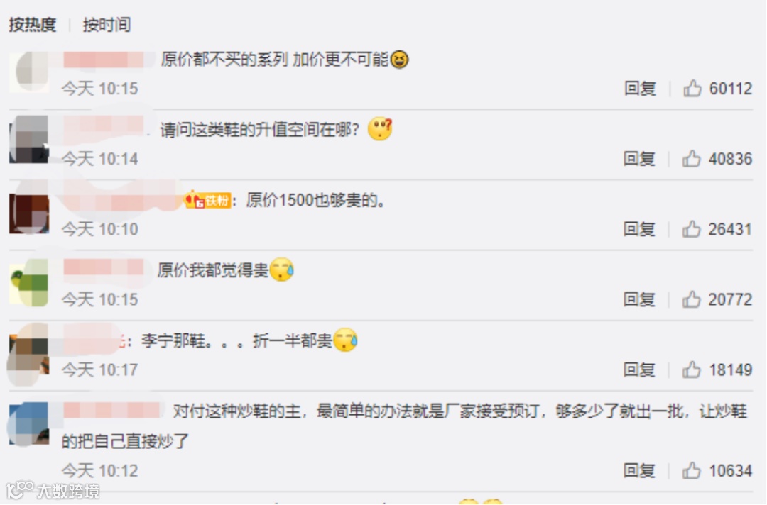 更多网友对炒鞋都持理性态度,认为无论官网、实体店,国货品牌选择很多,供应都很充足,也不存在涨价,部分还有打折,“不喜欢李宁,那就安踏、匹克、回力、特步嘛!牌子多了去了,已经下架的鞋,就不买了呗,换双鞋买。”
