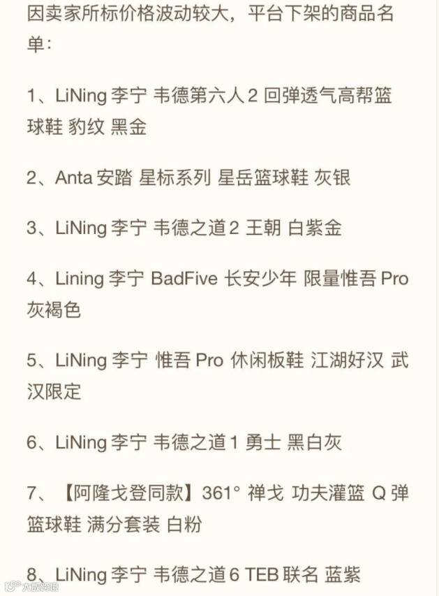 2、经核查,此次网传图中涉及的三款球鞋,即李宁韦德之道4全明星银白款、李宁韦德之道 7wow 7 The Moment 超越限量款粉色款和安踏哆啦A梦联名休闲板鞋白黑款,这三款球鞋的价格均为平台卖家个人所设定,且在卖家设定的价格下并无买家成交或极少有买家成交。目前,针对这三款中卖家所标价格波动过大的球鞋,已进行下架处理。