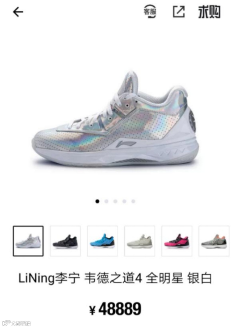 今年清明小长假期间,有媒体报道称,在得物APP上搜索发现,以李宁韦德之道4全明星银白款为例,页面显示仅有42码,付款后7天内到货,售价竟高达48889元。而该鞋参考发售价仅1499元,涨幅达31倍!但页面上却并无最近购买记录,似乎是“有价无市”。