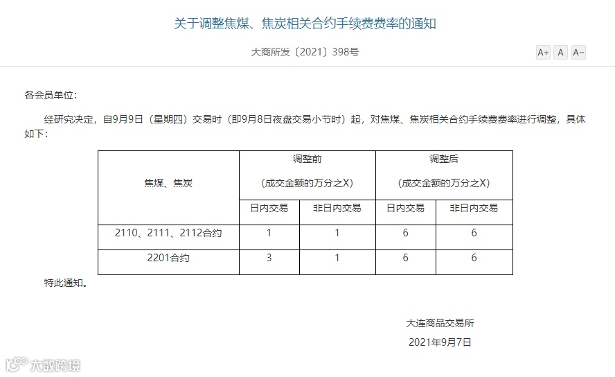 9月7日,大商所发布关于调整焦煤、焦炭相关合约手续费费率的通知:自9月9日交易时起,对焦煤、焦炭相关合约手续费费率进行调整,调整后,2110、2111、2112合约、2201合约手续费费率均为成交金额的万分之6。