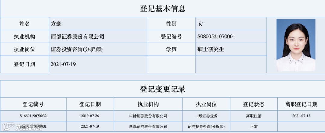 西部证券还迎来一名来自合资券商的分析师——方璇。方璇2019-2021年期间在申港证券担任海外与传媒研究员,曾有一年的金融科技产业经验,主要覆盖社交文娱、电商与本地生活、金融科技等互联网细分赛道。方璇今年7月加入西部证券担任互联网首席分析师。