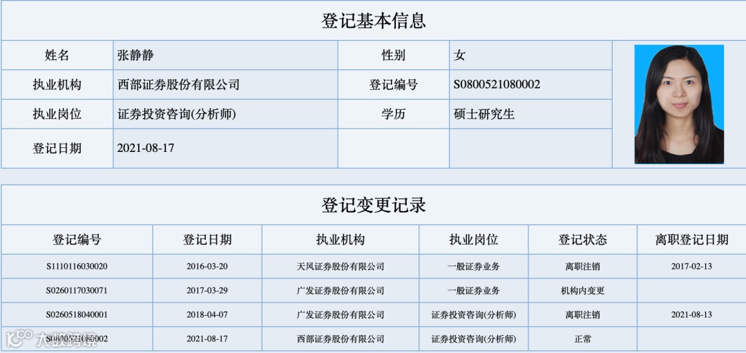 8月17日张静静在西部证券登记备案,担任宏观首席。根据履历,2016年张静静加入天风证券自营,2017年2月加入广发证券研究所宏观郭磊团队。
