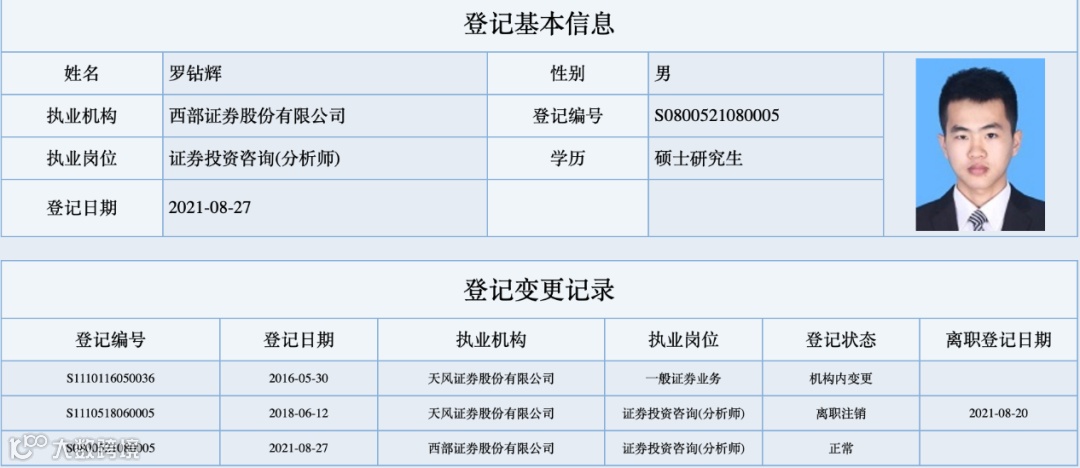 根据中证协信息,天风证券分析师罗钻辉8月27日登记为西部证券分析师。据了解,罗钻辉于8月中旬正式加入西部证券研究所,担任非银行业的首席。