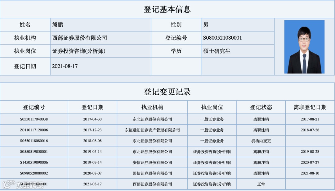 登记日期同样为8月17日的还有分析师熊鹏。据了解,熊鹏来自国信证券,他在今年8月中旬正式加入西部证券担任食品饮料行业首席。履历显示,熊鹏2017年3月开始从事卖方研究工作,更早之前就职于东北证券、安信证券。