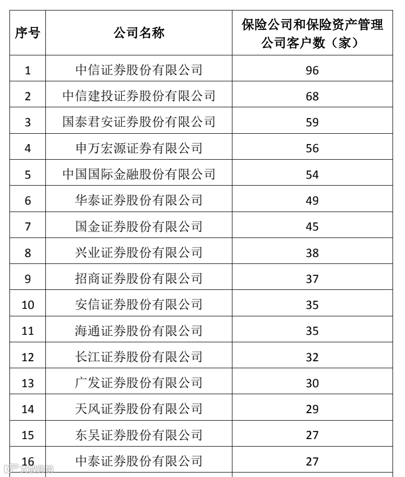 从保险公司和保险资管客户数排名来看,中信证券以96家稳居第一,中信建投、国泰君安分别以68家、59家的数量排名第二、第三位。