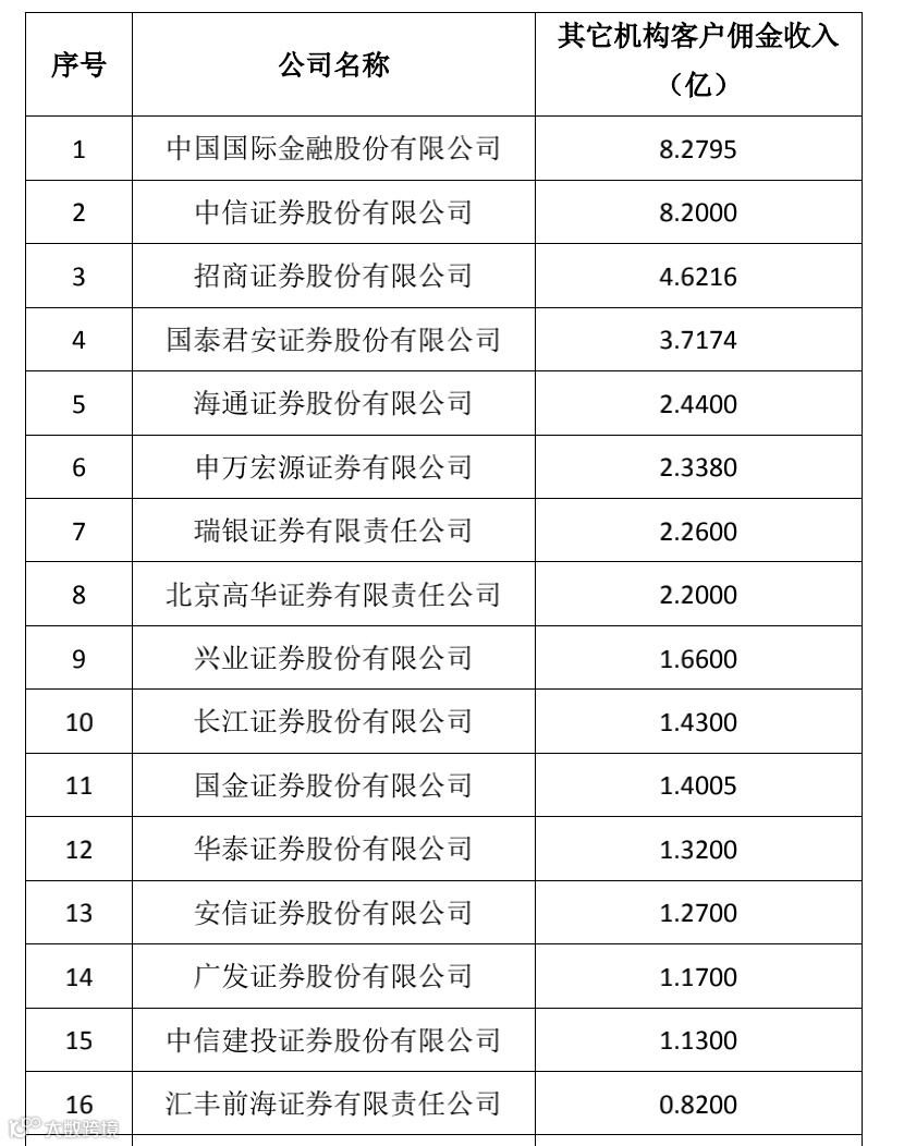 从保险公司、保险资管、QFII和RQFII机构、私募等其他客户来看,上述机构的佣金收入合计达到51.66亿,约为公募基金公司佣金收入1/3。从排名来看,中金公司、中信证券分别以8.28亿元、8.2亿元夺得状元与榜眼,并与第三名的招商证券(4.62亿元)拉开了差距。