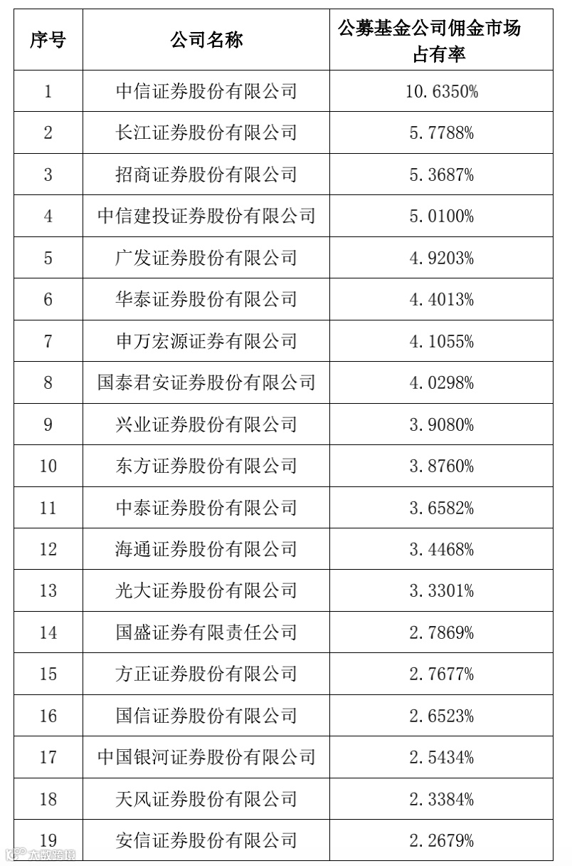 从公募基金公司佣金市场占有率来看,中信证券以10.64%的占有率遥遥领先,长江证券、招商证券、中信建投证券则分列第二至四名,占有率分别为5.78%、5.37%、5.01%。