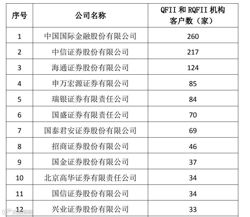 从QFII、RQFII机构客户数排名来看,中金公司与中信证券遥遥领先,分别拥有260家、217家客户,其次是海通证券,达124家。此外,申万宏源、瑞银证券、国盛证券、国泰君安服务的QFII、RQFII机构数也较多,分别为85家、84家、70家、69家。