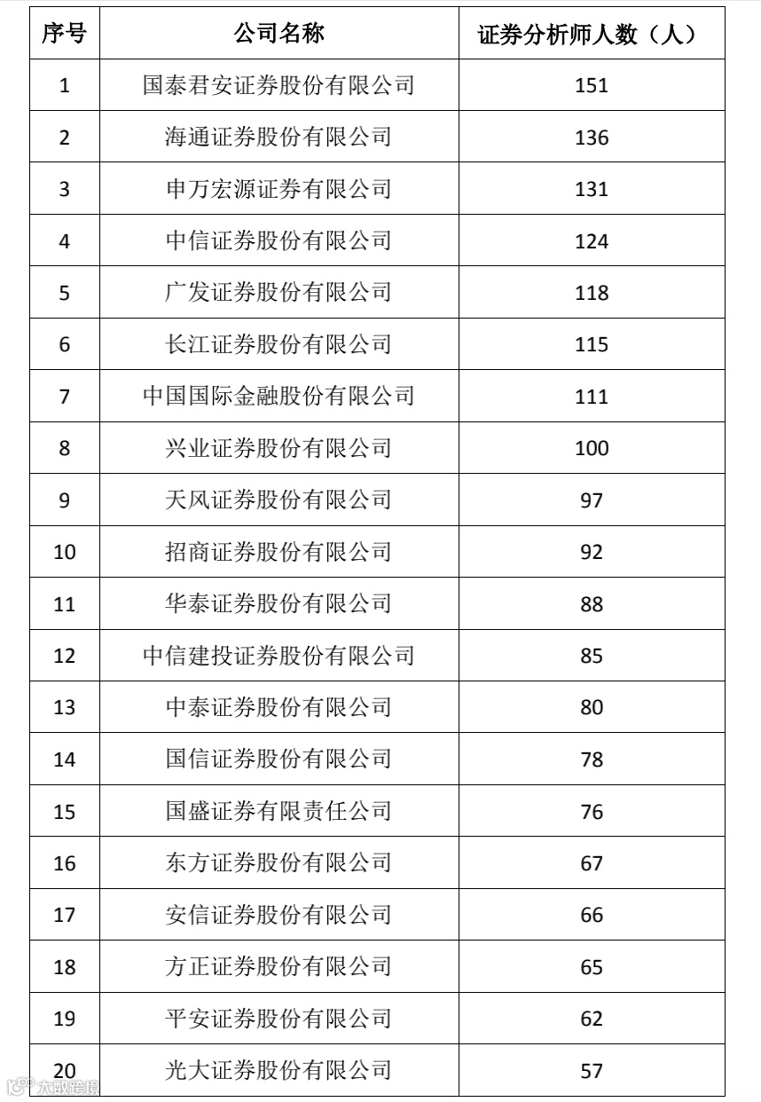 从占到券商研究部门主体的分析师来看,截至2020年末,分析师人数最多的券商有151位分析师,分析师人数前30位的公司分析师人数之和占全行业分析师70%。从分析师人数排名来看,国泰君安、海通证券、申万宏源分别以151人、136人、131人排名前三;中信证券、广发证券、长江证券、中金公司、兴业证券分列第4到8名,这八家券商的分析师人数均超过百名。
